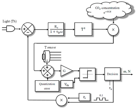 The Δ-Σ architecture is based on the net radiation signal received by the sensor, which is used to modulate the heating duty of the infrared light source. According to Stefan–Boltzmann’s law, the revived infrared radiation depends on the temperature of the light source as Equation (7) and it also is described by the Beer–Lambert’s L which is related to the gas concentration, shown in Equation (8).
