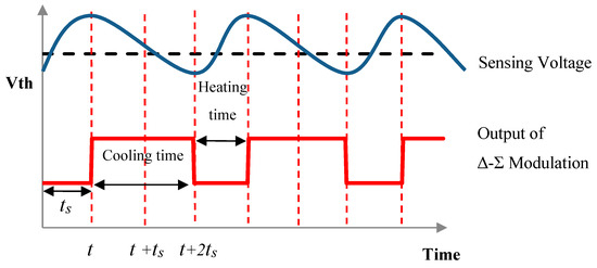 Figure 3 shows the measurement results as two curves, one is the sensing voltage of thermal radiation measured by the sensor and the other is the output signal of delta-sigma modulation. When the operating state of the light source altering, the output of the modulated signal will change to the corresponding state. In this process, the microprocessor based on the delta-sigma algorithm plays an important role. It monitors the change of the electrical signal from the light source through the preset scan time (denoted as ts) and identifies the current working state of the light source. After N times of sampling which is comprise of heating duty (denoted as m) and cooling duty (denoted as N-m) of light source, we can obtain the total sampling time (denoted as N × ts) and total heating time (denoted as m × ts). In our study, the signal reading is quantized as Ratio (Ratio = ). Finally, we can obtain the relationship between correct gas concentration and Ratio by mathematical derivation [6].