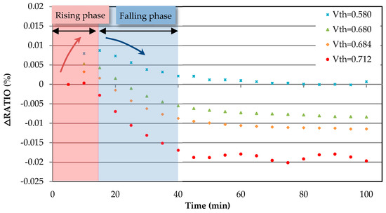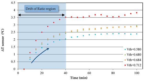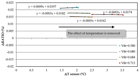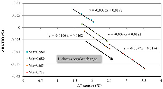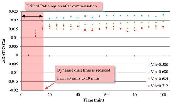 In order to analyze the changes of the operating temperature of the infrared light source caused by different heating duty, we keep the CO2 concentration at 500–600 ppm and set several Vth (0.580, 0.680, 0.684, 0.712 V) to observe how the light source effect on the dynamic drift of Ratio.