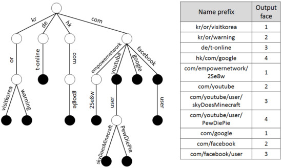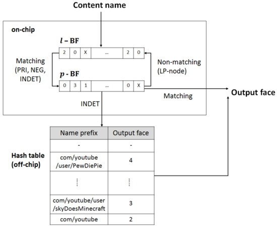 As another example, assume input name . First, the l-BF is queried using and returns level 4. However, since the number of input components is fewer than 4, the l-BF is queried again using . The l-BF then returns level 2. Since an ordinary node is accessed, the l-BF query should be continued, but there are no more input components. Hence, the p-BF is queried using . Subsequently, the p-BF returns the output face and the search is complete. In this case, the total number of Bloom filter accesses is 3, without any off-chip memory accesses.