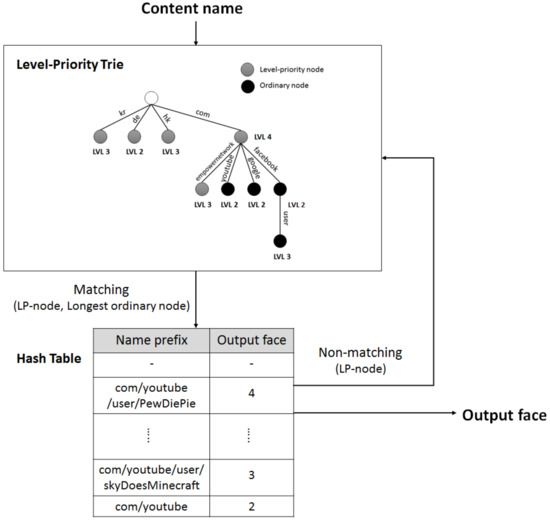 For a given input name, querying the l-BF produces one of four types of results: ORD, PRI, NEG, and INDET, as shown in Algorithm 2. The ORD result occurs when an ordinary node is accessed. In this case, the current level is remembered as the , and the l-BF querying continues as shown in Algorithm 1. The PRI result occurs when an LP-node is accessed. In this case, the p-BF is queried using the returned level. If the p-BF returns the output face by producing a positive result, the search immediately ends. Otherwise, if the p-BF produces a negative result (meaning that the longest name prefix does not match the input), the search procedure returns to the l-BF query for the next level. For the NEG (negative) result in the l-BF querying, the p-BF is queried from the while the level of access is decreased until a matching output face is found in the p-BF.