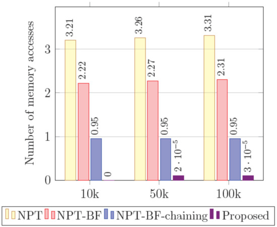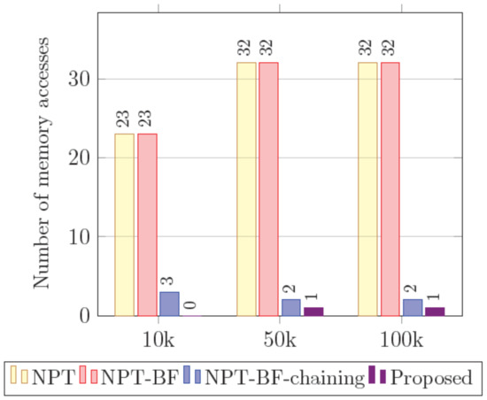 The LPT proposed in this paper provides benefits in terms of both the search performance and the memory requirement. If we assume a naive Bloom filter structure implementing an NPT, many empty nodes should be programmed and queried, starting from a root node. In order to avoid queries to empty nodes, if the search begins with the longest level, Bloom filter querying should continue until a matching name prefix is found while decreasing the level of access. Hence, if the NPT is more unbalanced, more memory accesses occur.