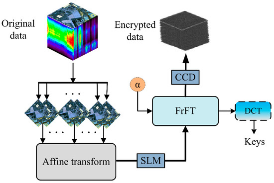 The flowchart of the intact encryption algorithm is displayed in Figure 1. As shown in the Figure 1, the original hyperspectral image was separated into single bands and then each possible pair of bands was combined by employing the affine transform. Subsequently, the scrambled data were converted in FrFT domain. Finally, the parameters α in FrFT generated in the encryption scheme were calculated by DCT. The output result of DCT serves as the key of the cryptosystem. In the encryption approach, two bands are combined into one complex function and then transformed in the FrFT domains. Therefore, the final encrypted data obtained in the output plane has only 50% bands of the original hyperspectral image. For instance, the original hyperspectral image having 100 bands is encrypted, and the corresponding encrypted data has 50 bands. Accordingly, the storage space of the encrypted data is reduced.