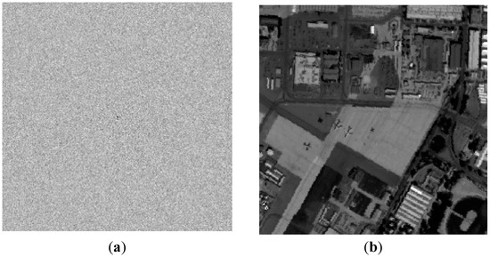 In this section, various numerical simulations are given to validate the performance of the proposed hyperspectral image encryption scheme. As shown in Figure 2, one hyperspectral image named “Sandiego”, having 189 bands, which was captured by AVIRIS (Jet Propulsion Laboratory, USA), was used in the following experiment. In fact, any other hyperspectral image or multiband data can be used to process the presented cryptosystem. To simplify the calculation, we selected the first 100 bands from the 189 bands in the original hyperspectral image. Therefore, the dataset was used in the following experiments having the size 256 × 256 × 100. The random function and in affine transform are the random functions having 256 × 256 pixels in the range of and , respectively. To simplify the encryption process, the parameter of FrFT was set to 0.5 in our encryption scheme. In fact, the parameters can be different for each band to enhance the security. The hardware parameters of the computer used in the simulation experiment are Core 2, CPU 2.1GHz, and 2048 Mb memory (T430, Thinkpad Lenove, Beijing, China). By using the conditions described above, the encryption results are displayed in Figure 3. As shown in Figure 3, the encrypted result is a noise-like image.