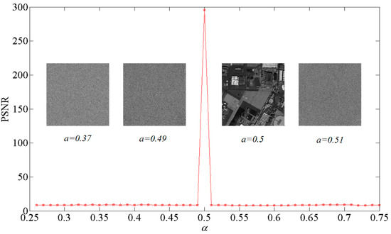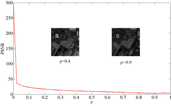where the function is the 27th band of the encrypted data and denotes with noise. The function represents the random data-satisfied uniform distribution. Besides, the parameter p is the coefficient representing the noise intensity. By using this noise model, the noise data can be added into the secret encrypted 27th band image with different intensity noise. The corresponding PSNR curve is depicted in Figure 7 by decrypting the data with various values of p. In addition, the two decrypted images drawn in Figure 7 are calculated with the noise intensity p = 0.4 and p = 0.9, respectively. The main information of the 27th band image can be recognized.
