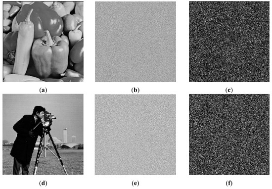 Only the single band encryption process of the intact encryption scheme is tested because of the huge amount of calculations in the attack experiment. Two test images, “Peppers” and “Cameraman”, having 128 × 128 pixels, are considered in the plaintext attack experiment. Firstly, two test images and their encrypted versions are shown in Figure 8a–e, respectively. Before the attack operation, assume that the original data “Peppers” and its encrypted pattern are obtained by the illegal user. Subsequently, the known plaintext attack and chosen plaintext attack are employed successively for the decrypted data of “Cameraman”. The attack results are illustrated in Figure 8c–f, which are random patterns.