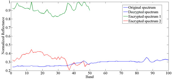 Finally, the performance of protecting the spectrum information is tested. The spectrum curves of the pixel (100, 100) before and after the encryption process are illustrated in Figure 9. As we can see from Figure 9, it is apparent that the encryption spectrum curves greatly differ from the original spectrum. Note that the original and decrypted spectrum are drawn in the same color and the two spectrum curves coincide to form one curve, which indicates that the secret spectrum information is retrieved completely. The result shown in Figure 9 demonstrates the performance of the cryptosystem in protecting the spectrum information. Here, the encrypted spectrum curves are separated into real part and imagery part because the encryption data of the proposed algorithm is a complex function. Therefore, the proposed encryption scheme can not only protect the image information in spatial domains, but also the spectrum information in spectral domains.