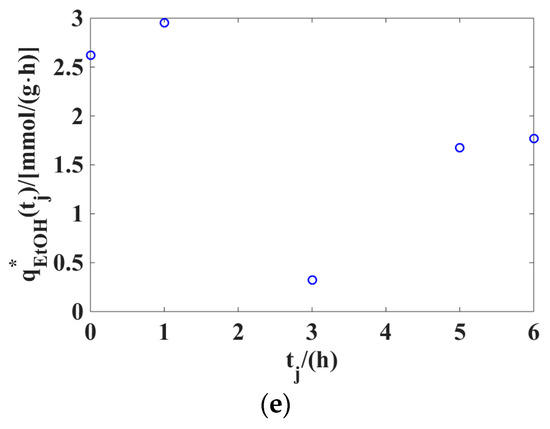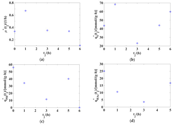 The optimal values μ*(tj), (tj), (tj), (tj), and (tj) of the variables μ(tj), qS(tj), qPD(tj), qHAc(tj), and qEtOH(tj), obtained by solving the optimization problem in Equations (79)–(90) in the first stage of the two-stage method: (a) μ*(tj); (b) (tj); (c) (tj); (d) (tj); (e) (tj).