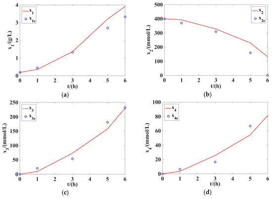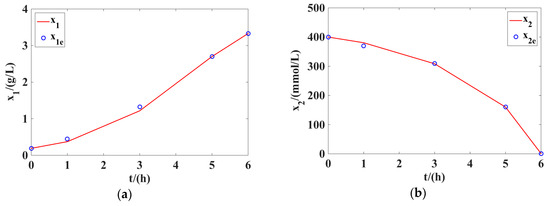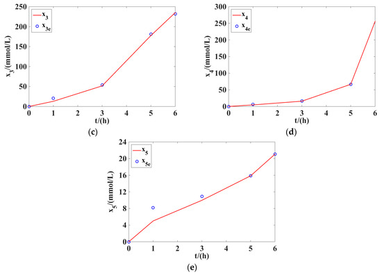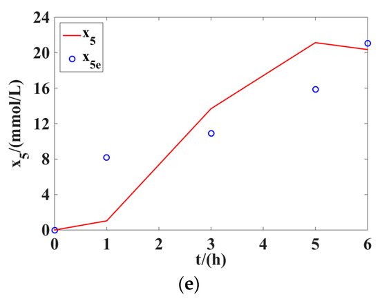 Figure 1 presents the optimal values of the variables (), , , , and , obtained by solving the optimization problem in Equations (79)–(90) in the first stage of the two-stage method. Applying these optimal values to the optimization problem in Equations (95) and (96) and then solving it in the second stage of the two-stage method, we could obtain the optimal values of 16 identified parameters (). These results are shown in Table 2. Table 2 also gives the lower and upper bounds for identified parameters (). Table 3 shows the comparison between the proposed two-stage method and the single-stage method applied in Reference [17]. As can be seen in the total error function value, the proposed two-stage method in this work could yield a smaller error between the measured and computed concentrations than the single-stage method applied in Reference [17], with a decrease of about 52.79%. This conclusion clearly shows the tractability and effectiveness of the proposed two-stage method in handling the parameter identification of the microbial batch process of glycerol to 1,3-PD.