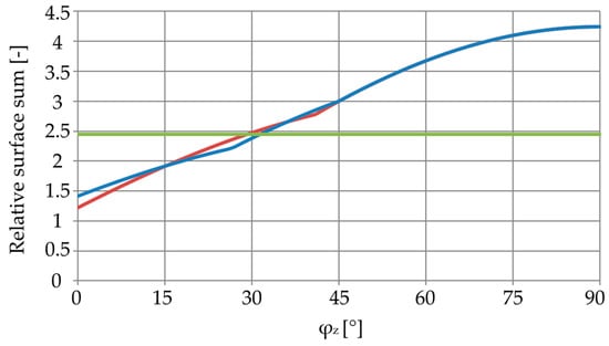 Let there be a truncated pyramid holder positioned according to Figure 4a, where the pyramid edge points toward the illumination source. The illumination source runs along the circle from the x-axis toward the z-axis. The change in the photodetector surface screening for segments SA, SB, and SC is depicted in Figure 4a. Similarly, let the truncated pyramid holder be positioned according to Figure 4b, where the pyramid wall points toward the illumination source. Again, the illumination source runs along the circle. The change in the photodetector surface screening for segments SA, SB, SC, and SD is depicted in Figure 4b. The total surface screening from all segments can be found by their sum independent of orientation. For case (a), the total surface screening is the sum of the SA, SB, and SC segments multiplied by 2. For case (b), the total surface screening is the priority sum of the SB and SC segments multiplied by 2 and the additional sum of the SA and SD segments. The surface screening of the shadowed photodetectors is zero. The total surface screening vs. angle φz is shown in Figure 5. All calculations were performed in Excel software (Microsoft, Redmond, WA, USA, 2007).