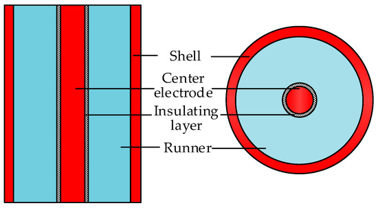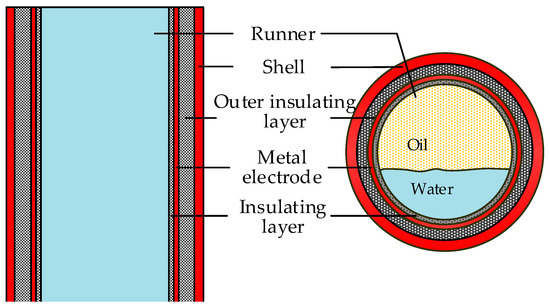 The cylindrical capacitance sensor as shown in Figure 2, is made up of a metal shell, an outer insulating layer, a metal electrode, and an inner insulating layer. The metal electrode is excited by voltage and sealed to insulate the shell and leads to the wire. The metal case is grounded. The fluid flows along the axis in the runner. While ensuring the response strength is measured by the sensor, in order to facilitate the stratified flow of the fluid and increase the measurable range of the fluid, it is necessary to increase the width of the runner so that the thickness of each layer is as small as possible. Moreover, the thinner the internal insulation layer, the wider the response range of the sensor.