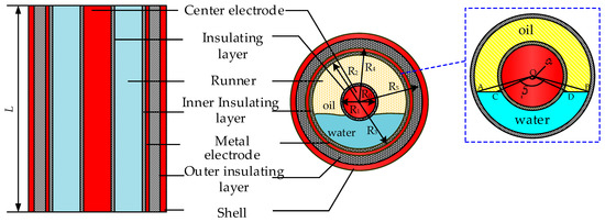 The designed CCS in this paper is a combination of the cylindrical capacitance sensor and the coaxial capacitance sensor. As shown in Figure 3, the center electrode of the coaxial capacitance sensor is placed at the center of the cylindrical capacitance sensor, which is in parallel with the metal layer of the cylindrical capacitance sensor. Both of them are electrodes. The shell of the sensor is grounded and the fluid flows in the annular region. For the CCS, the cylindrical capacitance sensor and the coaxial capacitance sensor act together and compensate each other, which increases the response range of the sensor in the state of stratified flow. The effective contact area between the oil bubble and the sensor is increased and the adhesion rate of the oil bubble is increased under the condition of non-stratified flow, thus improving the resolution of the sensor. In Figure 3, R0, R1, R2, R3, R4, and R5 are center electrode radius, insulating layer radius, flow runner radius, inner insulating layer radius, metal electrode radius, and outer insulating layer radius, respectively. L is the length of the sensor. α, β is the center angle of the circle with the radius of R1, R2 and oil–water interface, respectively.