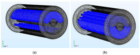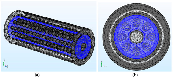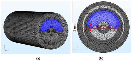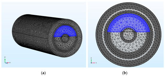 In order to obtain the response characteristics of CCS under different flow patterns, the finite element models of six flow patterns, including stratified flow (ST), stratified flow with mixing at the interface (ST&MI), dispersed flow that includes dispersion of oil in water and water flow (DO/W&W), oil in water emulsion (O/W), dispersion of water in oil and oil in water flow (DW/O&DO/W), and water in oil emulsion (W/O), which were proposed by Trallero et al. [9], were constructed. For ST flow patterns, the meshed model of the CCS is shown in Figure 4, where the blue color represents the oil phase and the area outside the annular runner represents the water phase for the ST flow pattern. In Figure 4, the water cut is 0.6.