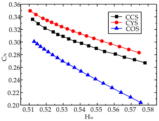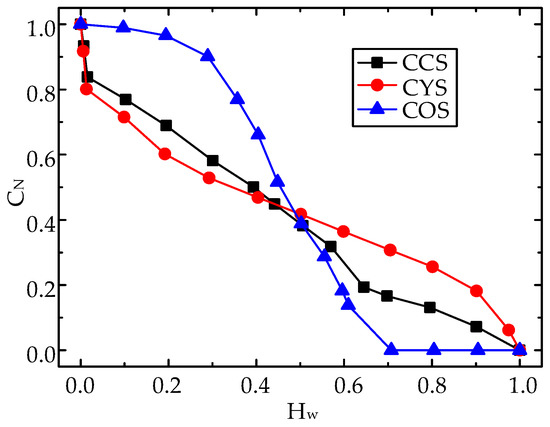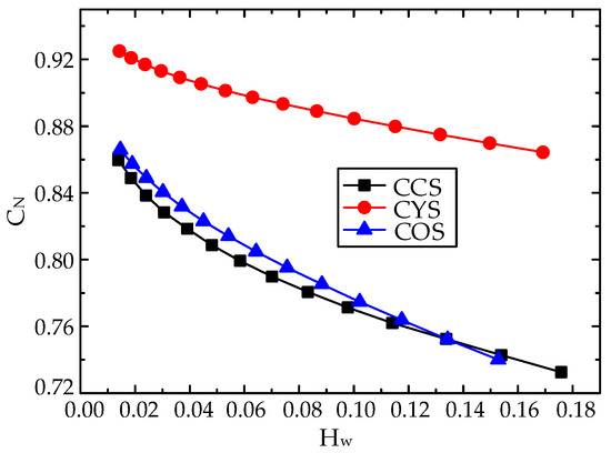 In order to better analyze the static response characteristics of the CCS, the sensors CYS and COS were modeled and simulated. Because the CCS is the combination of the CYS and the COS, the CYS and the COS were simulated with the same structural parameters and simulation conditions as the CCS. Using COMSOL simulation software, the static response curves of the CCS, CYS, and COS under the ST flow pattern were calculated by the finite element method as shown in Figure 5, where the math of the CCS represents the results calculated by the measurement principle of the CCS. As can be seen from the figure, the static response values of the CCS were basically consistent with the results obtained through the mathematical model, and the CN decreased with the increase of the water cut. The reason for the slight difference between the simulation results and the results calculated by the mathematical model is that in the mathematical model of the CCS, the capacitance C3 and C4 introduced by the boundary effect near the oil–water interface were approximately calculated. Compared with the CYS, the slope of the result curve of the CCS in the water cut range 0~0.4 and 0.6~1 increases obviously, which indicates that the resolution oil of the CCS was better under an ST flow pattern. The COS has no response when the water cut was greater than 0.63. The reason is that when the oil–water interface exceeds the center electrode, the oil phase cannot contact the electrode, so the response value of the COS will not change. The results show that the CCS has better resolution abilities compared with the CYS and the COS for the ST flow pattern.
