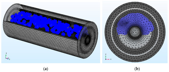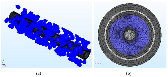 For the O/W flow pattern, the mesh model was constructed as shown in Figure 10, where the water cut is 0.795. The model was constructed similar to that of the DO/W&W flow pattern. The difference was that oil droplets of the same radius were also randomly distributed in the lower layers of the fluid. The initial number of oil droplets was 400. The water cut was changed by changing the quantity of oil droplets. The grid of the model was also encrypted. Figure 10a shows the relative position of oil droplets and the center electrode, and Figure 10b is the 2D model of the XOY section under the O/W flow pattern.