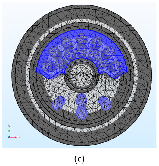 Figure 14 shows the mesh model of the CCS for the W/O flow pattern with the water cut of 0.1759. In order to realize the uniform distribution of water droplets in the continuous oil phase, the isometric water droplets were placed in the axial direction. The water cut was changed by changing the radius of the water droplet. Figure 14a shows the relative position of the water droplet and the center electrode, in which eight water droplets were placed in different radial positions in the same axial position and 20 oil droplets in different axial positions in the same radial position. Figure 14b shows the 2D model of the XOY section under the W/O flow pattern.