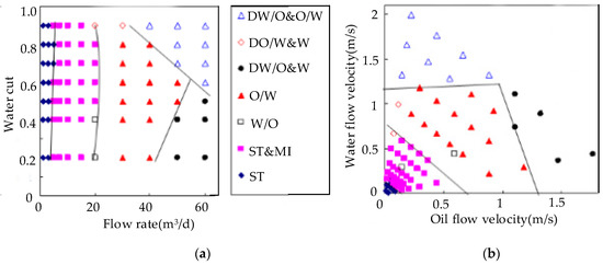 Flow pattern map of oil–water two-phase flow. (a) Flow pattern map based on flow rate and water cut; (b) flow pattern map based on oil and water flow velocity.