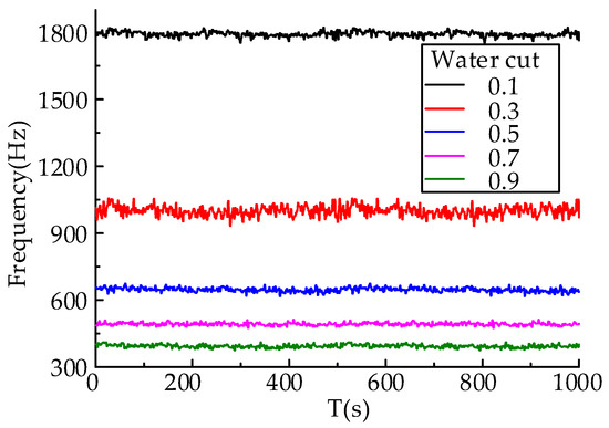 The frequency signal from the CCS with the flow rate of 30 m3/d varies with time as shown in Figure 21. As observed from the figure, the frequency values decrease with the increase of the water cut, which was consistent with the simulation results of the CCS. In addition, it can be seen preliminarily that the higher the water cut, the more stable the frequency.