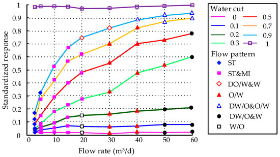In order to be more conducive to the comparison of values, the output frequency of the instrument was standardized by that of the pure oil phase and the pure water phase to obtain the standardized response. Figure 22 shows the response law of the instrument under different flow rates and water cuts. It can be seen from the figure that when the flow rate is 3~60 m3/d, and the water cut is 0~1, the instrument has a response characteristic. When the water cut is less than 0.2, the trend of the CCS response curve is relatively smooth. When the water cut reaches 0.3, the response values of the CCS become larger, especially when the flow rate is greater than 40 m3/d. This is because when the water content is greater than 0.3, the height of the oil–water interface reaches the boundary of the central electrode rod of the CCS. In this case, the capacitance of the sensor was more easily affected by the electrode rod, which was consistent with the simulation results. When the flow rate increased, the oil–water interface at the central electrode rod became more unstable. Additionally, the more susceptible the CCS was to the electrode rod, the greater the change of response value.