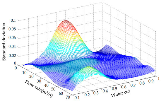 In order to obtain the fluctuation trend of the CCS under different working conditions, through setting parameters, a specified number of frequency values were sampled in a certain time using the instrument. In addition, the standard deviation [24,25] of all frequency numbers from each flow rate and water cut point was obtained. The standard deviation of each flow rate and water cut point was interpolated to obtain the 3D map, as shown in Figure 23.