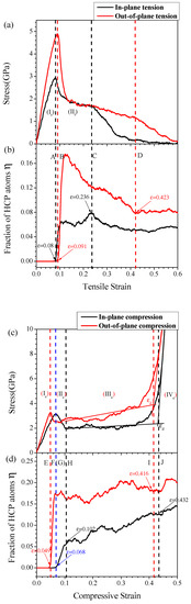 It is noted that the stress-strain curves for the groups 1 to 7 HONNs have the same trend and they just differ in the magnitude of the values. Without loss of generality, here we choose the 4th group of HONNs as examples to investigate the mechanical behavior and lattice structure evolution of the HONNs during the in-plane and out-of-plane tension and compression. Figure 2a,c show the stress-strain curves of the HONNs and Figure 2b,d show the corresponding variation of the fraction η of hexagonal close-packed (HCP) atoms with strain. The fraction η of HCP atoms is calculated by η = NHCP/Nall, where NHCP is the total number of HCP atoms and Nall is the total number of atoms in the sample. In order to study the relationship between stress-strain curves and the fraction η of HCP atoms, Figure 2a,b are divided by dash lines A, B, C and D (with the black dash lines A and C corresponding to the in-plane direction and the red dash lines B and D corresponding to the out-of-plane direction), respectively, while Figure 2c,d are divided by dash lines E to J, noticing that lines F and G are overlapped and indicated by blue line specially.