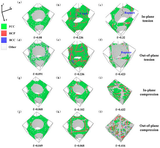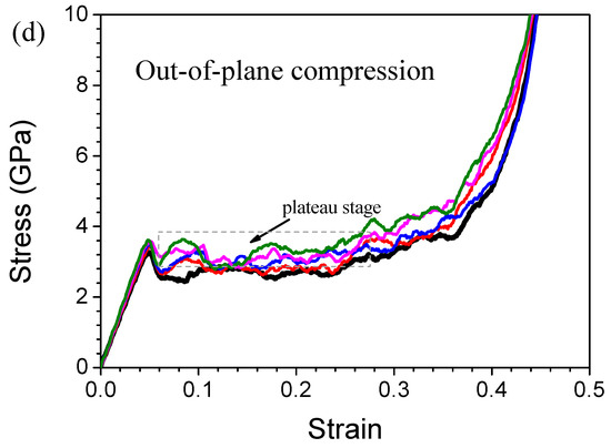 As for compression, it can be seen from Figure 2c that the stress-strain curves of the in-plane and out-of-plane compressions also have the same trend. Taking the in-plane compression as example, the stress-strain curves of compression can be divided into four stages (as shown in Figure 2c): (Ic) initial linear elastic stage, (IIc) instability of pore, (IIIc) collapse propagation and (IVc) densification stage. At the beginning of compression, sample enters into the linear elastic stage and reaches the peak stress (defined as the ultimate compressive strength σuc) (Stage Ic). After reaching the peak stress, the pores become unstable and begin to collapse, which shows a dramatic strain-softening in stress-strain curve (Stage IIc) and then the collapse begins to propagate, which causes a plateau stage in stress-strain curve (Stage IIIc). Finally, the strain-hardening effect becomes noticeable in the stress-strain curves which means the sample enters into densification stage (Stage IVc). The densification strain εd can be determined roughly by the intersection of tangents to the stress–strain curve for the cell wall collapse regime and densification regime [53]. Dash lines E and F correspond to the peak stresses for the out-of-plane and in-plane compressions at a strain of 0.049 and 0.068, respectively. Similar to the tension η-strain curves, the fraction η of HCP atoms has a very small value when the stress reaches the ultimate compressive strength σuc. From the atomic snapshots corresponding to σuc as shown in Figure 3g,j, it can be seen that, a few regions of the sample have entered into plastic deformation from elastic deformation. And then the sample enters into Stage IIc (see Figure 2c). The end of Stage IIc for the out-of-plane and in-plane compressions is divided by dash lines G and H at strain of 0.068 and 0.102, respectively. Figure 3d shows that the fractions η of HCP atoms rise sharply during Stage IIc. The atomic snapshots at the strain of 0.068 and 0.102 shown in Figure 3h,k hints that more and more dislocations and stacking faults are generated during Stage IIc. After that the fractions η of HCP atoms slowly increase through the Stage IIIc and enter into Stage IVc eventually. The atomic snapshots at the densification strain determined by tangent corresponding to dash lines I and J are shown in Figure 3i,l, in which the void is completely filled with the atoms and the RVE is nearly densified accompanied with lots of dislocations and stacking faults.