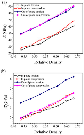 As the relative density changes from 0.43 to 0.68, in the in-plane direction, the tensile modulus increases by 144.1% from 25.1 GPa to 61.28 GPa; the compressive modulus increases by 141% from 28.7 GPa to 61.17 GPa; σut increases by 104.1% from 1.95 GPa to 3.69 GPa; and σuc increases by 155.3% from 1.79 GPa to 4.57 GPa. For the out-of-plane direction, the tensile modulus increases from 49.66 GPa to 90.06 GPa by 81.3%; the compressive modulus increases from 48.63 GPa to 91.06 GPa by 87.2%; σut increases from 3.54 GPa to 6.24 GPa by 76.2%; and σuc increases from 1.96 GPa to 4.55 GPa by 132.1%. From Figure 4 it can be seen that the out-of-plane mechanical properties are generally superior to those of the in-plane direction. The main reason for this phenomenon is the in-plane direction has a weakness in ligament (marked in Figure 3b,c) which may induce stress concentration and lead to successive deformation and rupture of ligament. Compared with the in-plane direction, the samples have a more homogeneous deformation in the out-of-plane direction.