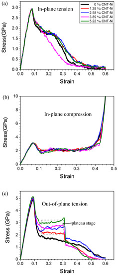 Figure 6 plots the average stress of the CNTs embedded in the CNHONNs with a ωCNT of 5.22‰ with respect to strain. The stresses in the CNTs considerably depend on the loading directions. Compared to the in-plane tension and compression, Figure 6 shows that the CNTs can bear more loads during the out-of-plane loadings, resulting in a better reinforcement of CNHONNs in the out-of-plane direction due to the addition of CNTs. The interface between CNT and Ni is so weak that the load cannot be effectively transferred in the in-plane direction, resulting in defects at the interface, which is similar to the CNT-reinforced metallic glass nanocomposites [40]. This is why the in-plane mechanical properties of the CNHONNs are similar to those of the HONNs and sometimes they are lower than those of HONNs, as evidenced by the result in Figure 5. The main reason for the difference in the in-pane and out-of-plane reinforcing effect of CNTs is the anisotropy of CNTs and the weak interfacial bonding between C and Ni.