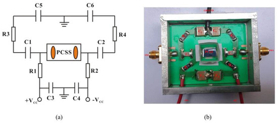 The schematic diagram and the photo of bilateral sweep circuit based on the GaAs PCSSs are shown in Figure 2a,b, respectively. The capacitances of filter capacitors C1, C2, C5 and C6 are 10 nf. The capacitances of energy storage capacitors C3 and C4 are 33 pf. The resistances of current-limiting resistors R1, R2, R3 and R4 are 470 kΩ. In order to improve the circuit’s bandwidth, these capacitors and resistors are the surface-mounted components with small parasitic parameters and high voltage capacity (3000 V).