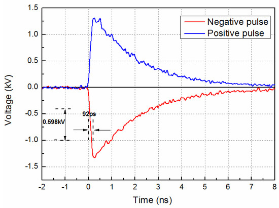 As shown in Figure 4, the peak voltage of negative output pulse is 1.329 kV, and the transmission efficiency is 66.45%. The rise time of the pulse is 164 ps, and the time of linear range constitutes 92 ps with the corresponding voltage range of 0.598 kV, which yields a slope of 6.5 kV/ns. The rise time of positive pulse and the fall time of negative pulse are 174 ps and 164 ps, respectively, the difference is about 10 ps, and the error is about 6%, which is within the margin of error, for a femtosecond streak camera. The error is mainly caused by the electrical elements (resistors and capacitors) in electrical circuits, because their values are not exactly the same for two corresponding elements in the symmetric sweep circuits in Figure 2. The rise time of the pulse is mainly decided by the photoelectric response time of the GaAs substrate and the time duration of pump laser, and the pulse width is mainly decided by the lifetime of carriers of GaAs substrate. Moreover, the performance of the device can be improved by optimizing device geometry parameters. For example, the impedance of device elements should be matched by optimizing the microstrip line.