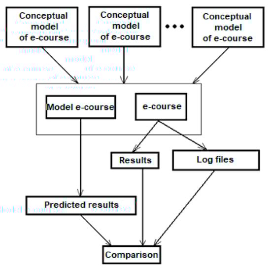 Figure 2 shows how the results of the research were achieved. Using the conceptual models of Petri nets from the previous chapter, an e-course was created that would also deploy in the classroom and an e-course model that would be used to simulate the behavior of students in the e-course. From the e-course, log files would be obtained to know how students behaved in the e-course and which parts they used. In addition, information about students passing the test would be acquired. Predicted results from the e-course model would be obtained and then compared with real results.