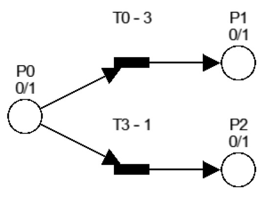 When the weight was added to transitions, the first three transitions could be swapped for one transition with a weight of 3. Then there was a chance that the token would move to P1 is 3:1 [26,27]. The approach was useful in calculating the final probabilities of multiple branched events.