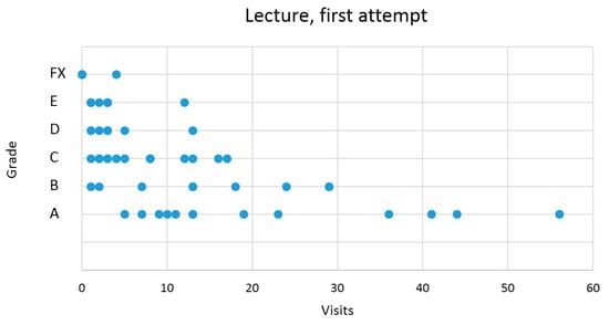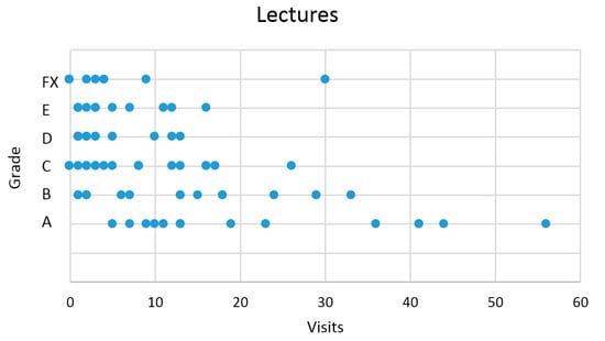 Based on the obtained graphs, it could be presumed that the parameter that influenced the students’ success the most in the final exam was their visit in “Lectures” material in Moodle. Therefore, the graph in Figure 14 was created.