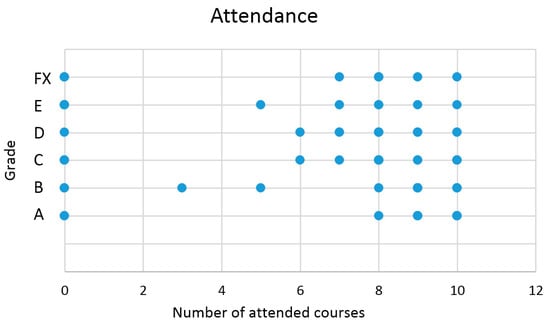 In Figure 7, it was obvious what grade the students got based on access to the study materials “Lecture”. The horizontal axis represents the number of visits and the vertical axis the final grade of the student. The lectures were in PDF format. These contained the most information to help students to pass the exam. The correlation of attendance and final ranking was −0.48723, the highest for this section, which represented a moderate correlation rate. The correlation analysis examines the tightness of the statistical dependence between the quantitative variables. The correlation coefficient is the extent of the linear dependence of the two variables. The coefficient is calculated by dividing the covariance with the standard deviation. The value of the coefficient is in the interval from −1 to 1 where −1 represents the indirect proportion, 1 is the direct proportion, and 0 represents the independence of X and Y. According to Cohen, the interpretation of the correlation coefficient is divided from 0.0 to 1.0 (trivial correlation, small, medium, big, very big, almost complete).