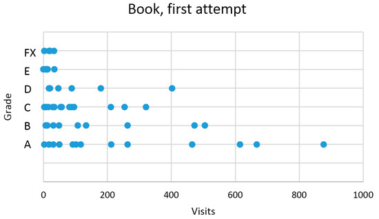 For students who succeeded on the first attempt or gave up after the first attempt, correlation based on Moodle“Book” visit was −0.43742. Their arrangement can be seen in Figure 13.