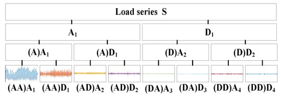 Wavelet transform (WT) is an efficient tool for signal analysis in the time-frequency domain. As an extension of WT, WPT further decomposes the detailed information in the high-frequency region [37]. This ability makes it possible for WPT to be applied to remove Gaussian noise from the original signal. Based on the multi-resolution analysis (MRA) [38], the procedure for a 3-level signal decomposition is shown in Figure 1. The load series S is broken down into approximation (A) components and detail (D) components.