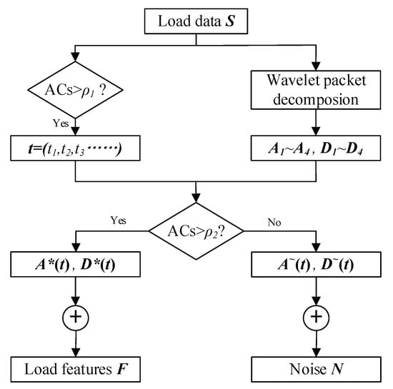 According to Figure 2, the load data is divided into load features and noise . and are the standards for load data filtering in time domain and wavelet domain. , and , are the sub-series of wavelet components at time series . To be proportional to correlation, ACs are in the form of absolute value. Indeed, the PCCs between different approximation and detail components are near zero since the components are decomposed by orthogonal wavelet bases. Then, Equation (1) is also expressed as
