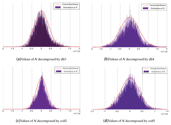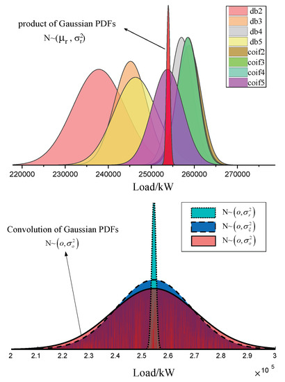 In practice, the load data set is divided into training samples and testing samples for validation. To accomplish the PLF task, an integration scheme composed of the methods in Section 2 is proposed. The flowchart of the integration scheme is shown in Figure 6. As is seen in the flowchart, training samples are broken down into components by the method mentioned in Figure 2, and testing samples are extracted with the same indexes in the time domain and wavelet domain. Then, the Gaussian method in Equation (6) is employed to obtain the Gaussian distribution from the homogeneous components decomposed by the wavelet families, where is treated as in IWELM model and is the variance of Gaussian noise. An example for this Gaussian process can be seen in Figure 7.