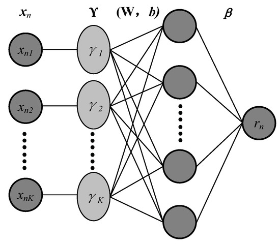 (2) Weighted ELM: Considering the importance degree of features, a branch of ELM called weighted extreme learning machine (WELM) inserts a coefficient matrix between and . WELM associates each input feature with the hidden layer through a controllable parameter . The whole model is expressed by rewriting Equation (9) as