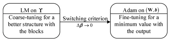 Then, the switch algorithm is employed to eliminate , , which are the redundant parts of and , respectively. The scheme for the proposed switch algorithm is shown in Figure 5. This switch algorithm reserves the accuracy of the iterative algorithm and reduces the computation through a 2-layer loops frame that is composed of the LM and Adam algorithm. A specific criterion is involved in switching from LM to Adam.