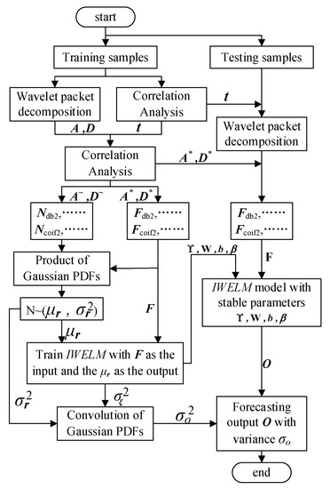 In the next step, all features F decomposed by the involved wavelet family are gathered as the input of the IWELM model. Then, the model is trained with Algorithm 1 on training samples . is the variance of errors between and training output, which is also deemed as the model uncertainty.