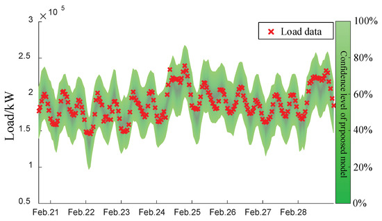 Validating the proposed model with load data of station 1, the forecasting results are formed from load values with CIs that are determined by the total uncertainty. The former and latter 200 h of forecasting results are respectively shown in Figure 9 and Figure 10. The palettes attached to the right of the figures indicate that the confidence level ranges from to , which corresponds to the color changes from dark green to light green. It can be recognized that the results are credible most of the time. Table 1 presents the accuracy of the forecasting results under various confidence levels. The confidence level can be obtained by setting the value of z according to the standard normal (z) distribution table. Then, the accuracy is represented by the coverage of CIs ranging from to .