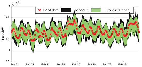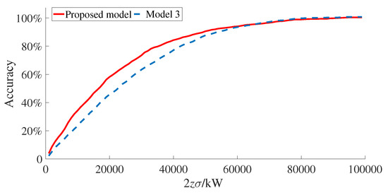 (2) Uncertainty under equal accuracy (U/A): U/A is obtained by summing the total interval size under the same accuracy. It provides a feasible way to deal with the variable interval size, which is a barrier in comparing the PI and CI methods. Lower uncertainty also means fewer risks of predicting load within a required accuracy level. Comparing Model 2 and proposed model under accuracy of , the results in Figure 12 show that the proposed model can forecast the load with a smaller interval size.
