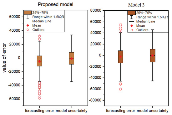 Statistical box-plot for forecasting error contrast to uncertainty of the proposed model and Model 3.