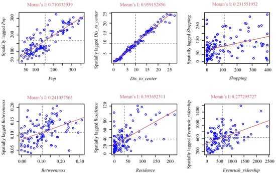 Figure 3 are 0, indicating that they are not randomly distributed in space. In addition, most belong to the first and third quadrants, which indicates that the variables show significantly positive spatial autocorrelation. The three explanatory variables with the highest Moran’s I values are population, distance to the city center, and days since station opened, as their Moran’s I values are greater than 0.3 [