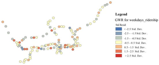 Figure 4 shows the standardized residuals of the GWR model for average weekday ridership, and for most stations these are relatively small, demonstrating the high accuracy of the model. Overpredictions (red bubbles) and underpredictions (blue bubbles) are randomly distributed in