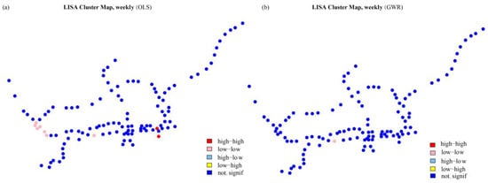 Figure 5 shows the LISA cluster maps of residuals in the OLS and GWR models for average daily ridership over a whole week. The residuals of the OLS model give significantly positive high-value clustering, while in the GWR model almost all of the clusters of residuals are ruled out, implying that GWR makes a significant improvement over OLS in terms of model fitting from the perspective of residuals.