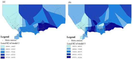 38], the Shenzhen Metro coverage area can be divided into several Thiessen polygons according to the locations of the stations. Here, the spatial distribution of the local R-squared and local coefficients is visualized using Thiessen polygons. The values of the local R-squared range between 0 and 1, which indicates the satisfactory fitting of the local regression model. Mapping the local R-squared values can help us to see where GWR has a higher predictive capacity and where it performs poorly.