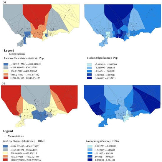 For the individually selected factor in Model 2, the mean of the elasticities for the office variable is 2397.24. Thus, for each new office within the station’s PCA, the number of trips adds up to 2397.24 each weekday. Elasticities are higher (more trips attracted per office) in the east and west than in the middle, whereas the elasticities of the central and north regions are negative and low, indicating that people who go to work in these regions depend more on transport other than the metro. In addition, the t-value map on the right shows that the effect of offices is more significant in the east, west, and mid-south areas at a 0.05 level (the absolute value is larger than 1.96) (