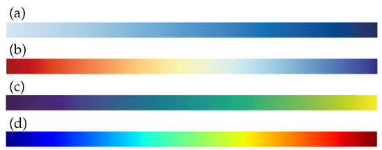 Rainbow colormaps (e.g., jet in Figure 1d) have been used frequently in many visualization designs. However, recent studies show that rainbow colormaps have several limitations, especially for mapping ordinal data, as they lack perceptual ordering [48,49,50]. Furthermore, they are not suitable for colorblind users [49]. A lack of perceptual ordering and uncontrolled luminance variation can be misleading for data interpretation [48].